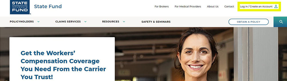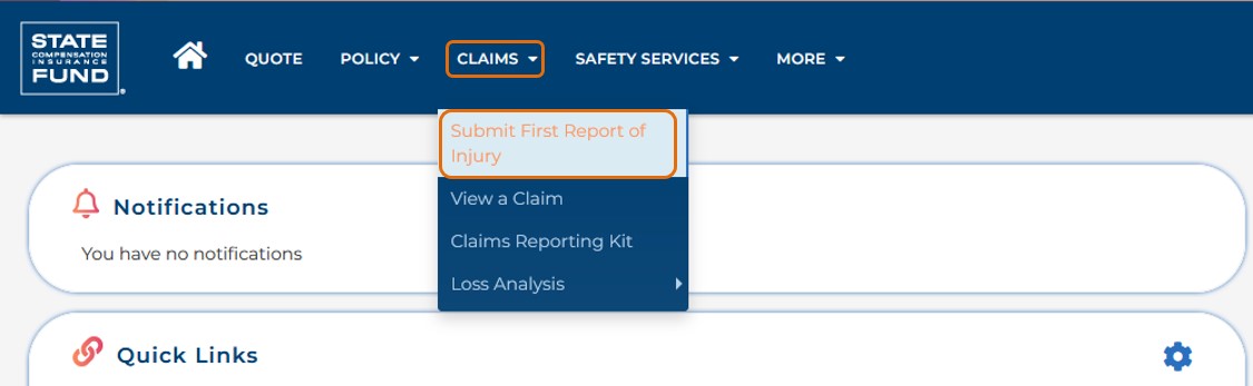 - Desde la barra de menú en su panel de State Fund Online, haga clic en el menú desplegable de RECLAMOS.