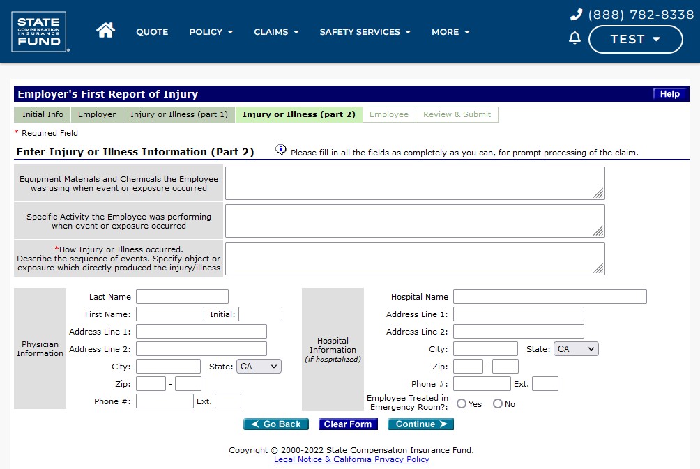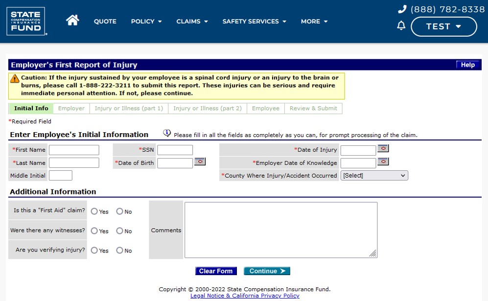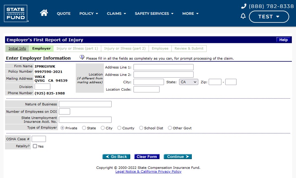 Cuando presente su reclamo en State Fund Online, el sistema lo guiará para completar el Informe del Empleador sobre Lesiones o Enfermedades Ocupacionales (formulario e3067), completamente en línea. No necesitará descargar y llenar la versión en PDF del formulario. En State Fund Online, este formulario se denomina Informe Inicial de Lesiones.