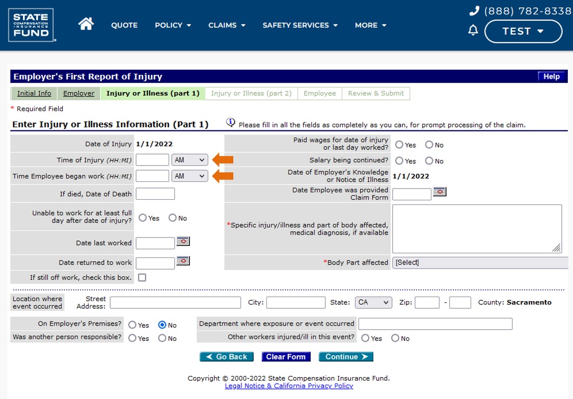 - Ingrese la información sobre la lesión o enfermedad. Nota: En los campos "Hora de la lesión", deberá ingresar la hora como un número de cuatro dígitos. Ejemplo: Si la lesión fue a las 8:15 AM, debe ingresarse como 08:15 AM.