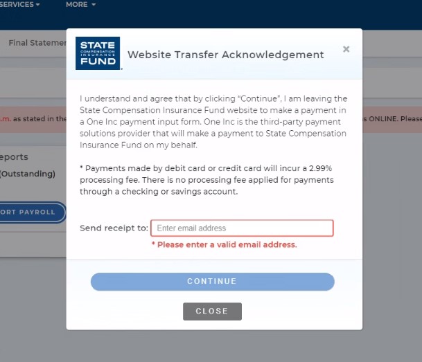 - A continuación, deberá leer y aceptar el "Reconocimiento de Transferencia de Sitio Web" que le pedirá ingresar una dirección de correo electrónico a la que se enviará el recibo de pago. Seleccione "Continuar" para ser dirigido a nuestro proveedor de servicios de pago, One Inc, donde podrá realizar su pago.