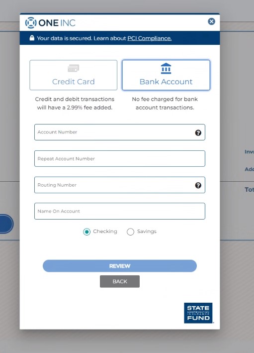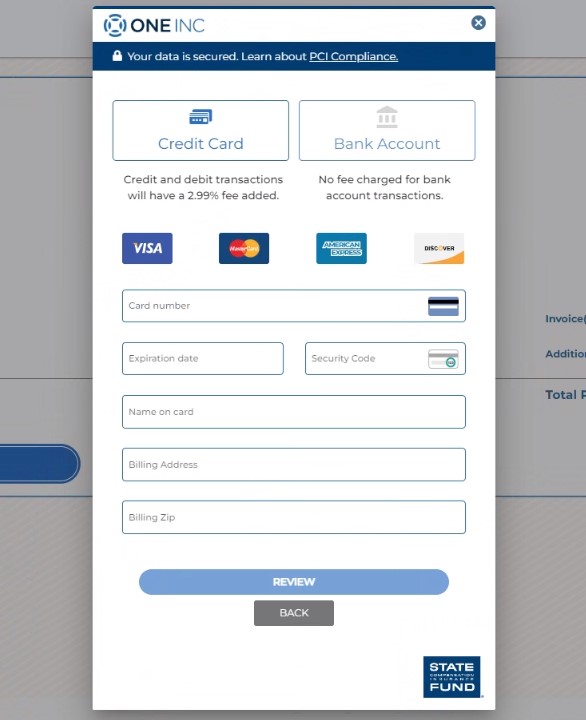 - Elija entre pagar con tarjeta de crédito/débito o con un retiro directo desde una cuenta bancaria, y haga clic en el botón correspondiente etiquetado para esa opción. NOTA: One Inc cobra una tarifa de procesamiento del 2.99% para transacciones con tarjeta de crédito y débito. No hay cargo por pagar desde una cuenta bancaria. Luego, llene los datos solicitados para su tarjeta de crédito/débito o cuenta bancaria.