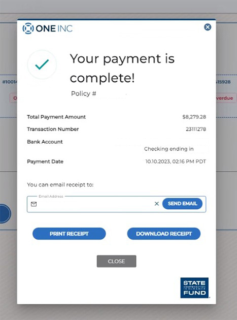 - Se mostrará una nueva pantalla que dice "¡Su pago se ha realizado!" una vez que el pago se procese. Tendrá la opción de enviar el recibo por correo electrónico, imprimirlo o descargarlo. Haga clic en "cerrar" para cerrar la ventana.