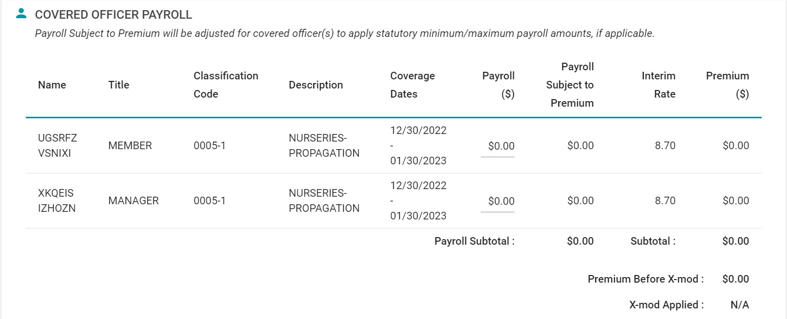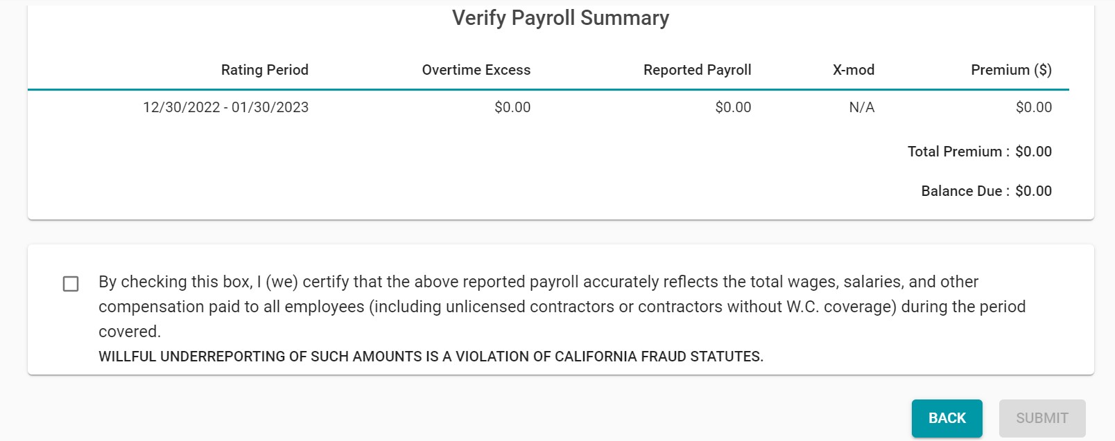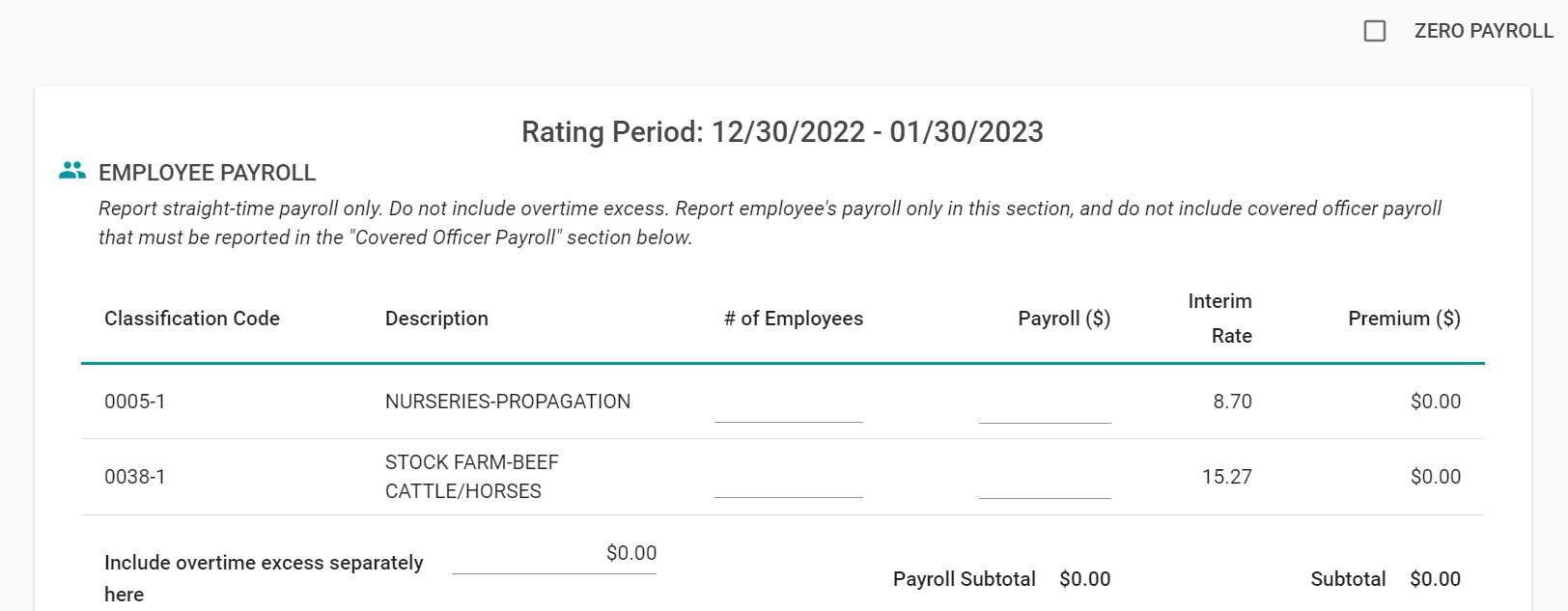 - En la pantalla de la nómina salarial, haga clic en la casilla de "nómina cero" en la parte superior si no tiene nómina que informar, o llene el número de empleados y los montos de las nóminas para los códigos de clase enumerados. Si los códigos de clase que ve en su nómina salarial no son correctos, contacte a su asegurador o comuníquese con el servicio al cliente al (888) 782-8338.