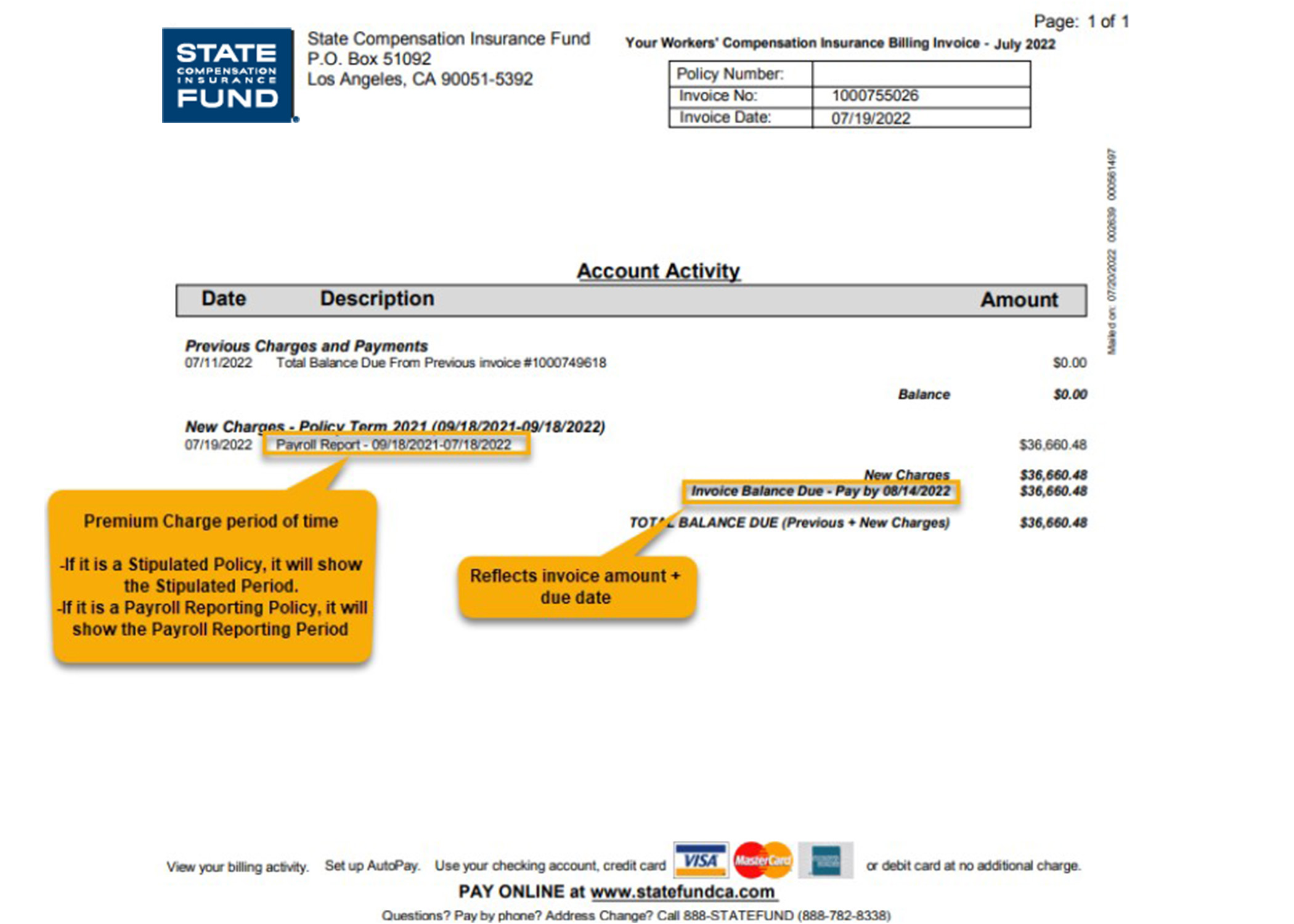 Esta próxima factura muestra la nómina que ha informado y el tipo de período de reporte de nómina que tiene su póliza. También incluye cargos y pagos anteriores. El cálculo de los pagos pasados y los cargos actuales mostrará lo que debe para mantener su póliza con un buen estatus.