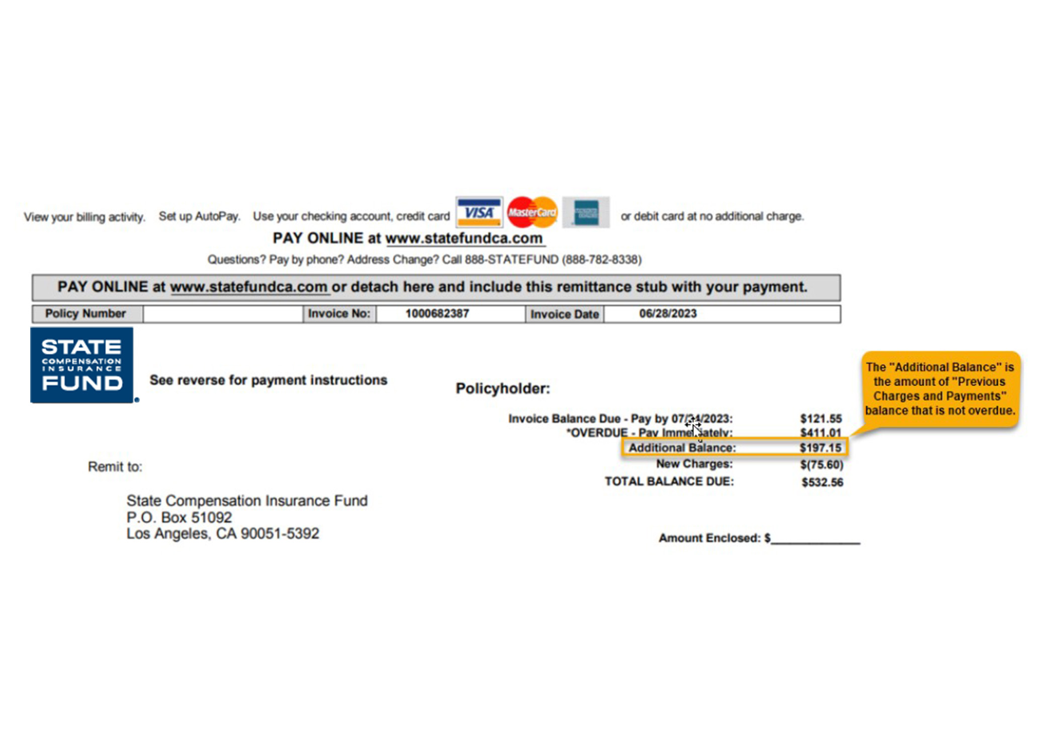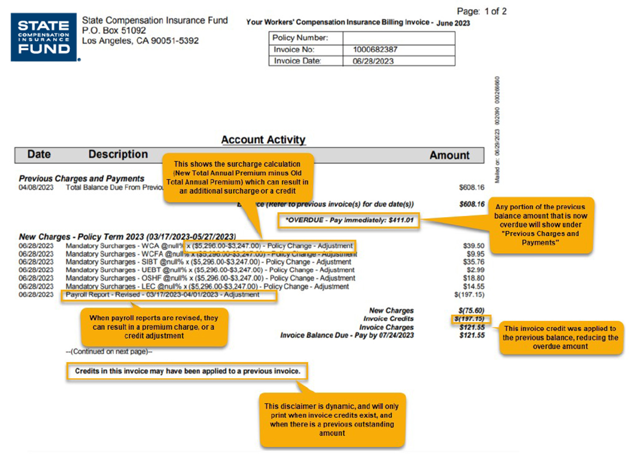 El siguiente elemento muestra cómo se verá su factura si tiene un pago vencido y un cambio en la tarifa de la prima por cambios en su nómina salarial. Al igual que en el último ejemplo, incluye un cálculo de los créditos pasados y los cargos actuales, con un total listado en la parte inferior para cualquier pago pendiente.
