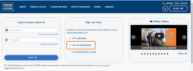 - En la esquina superior derecha de la página de inicio de www.StateFundCA.com, haga clic en INICIAR SESIÓN. Esto le llevará a la pantalla de inicio de sesión, donde puede acceder a State Fund Online.
