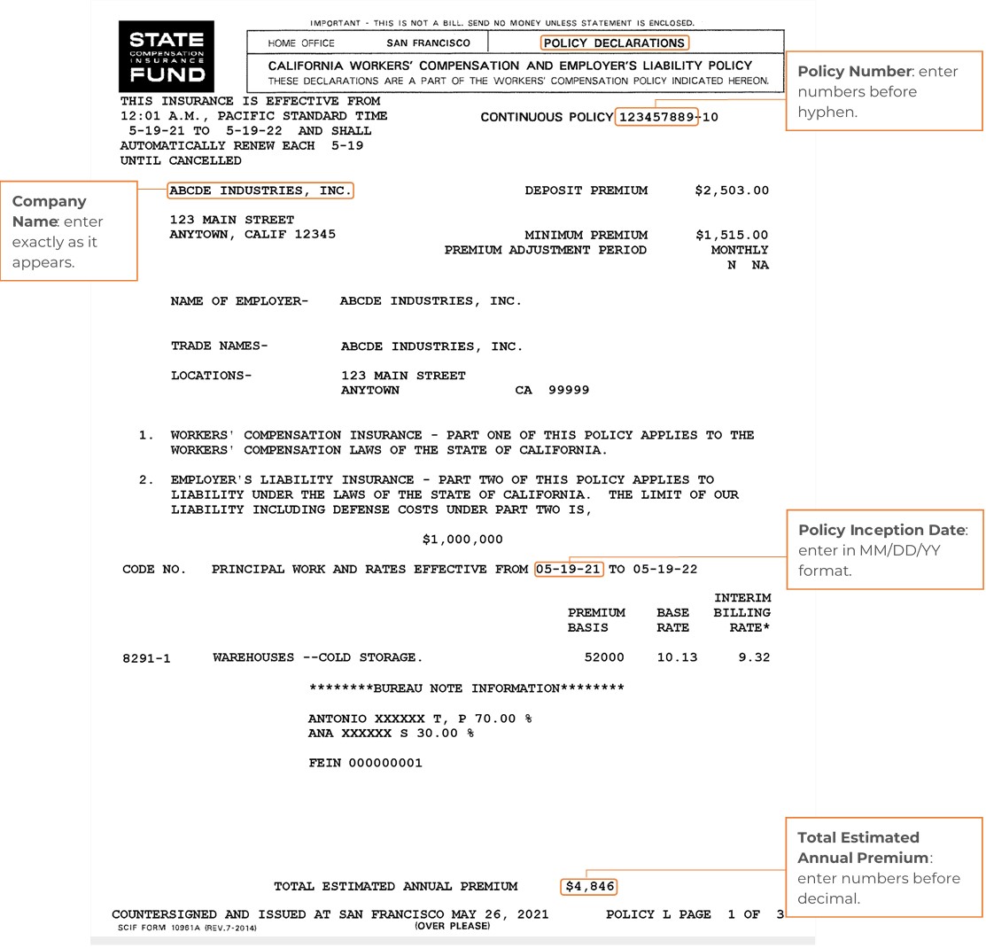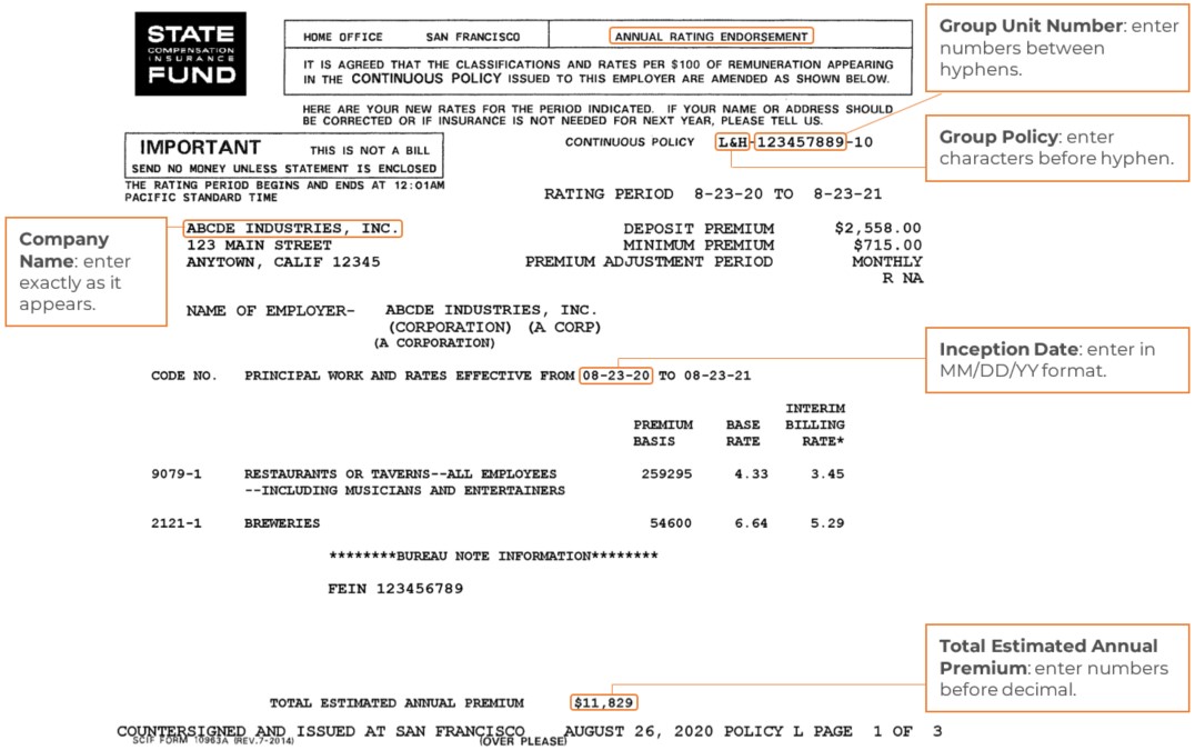 Nombre de la empresa: Asegúrese de ingresar el nombre de su empresa exactamente como aparece en su Endoso de Clasificación Anual (ARE, por sus siglas en inglés) o en el documento de Declaraciones (DEC). De lo contrario, la póliza no estará vinculada.
