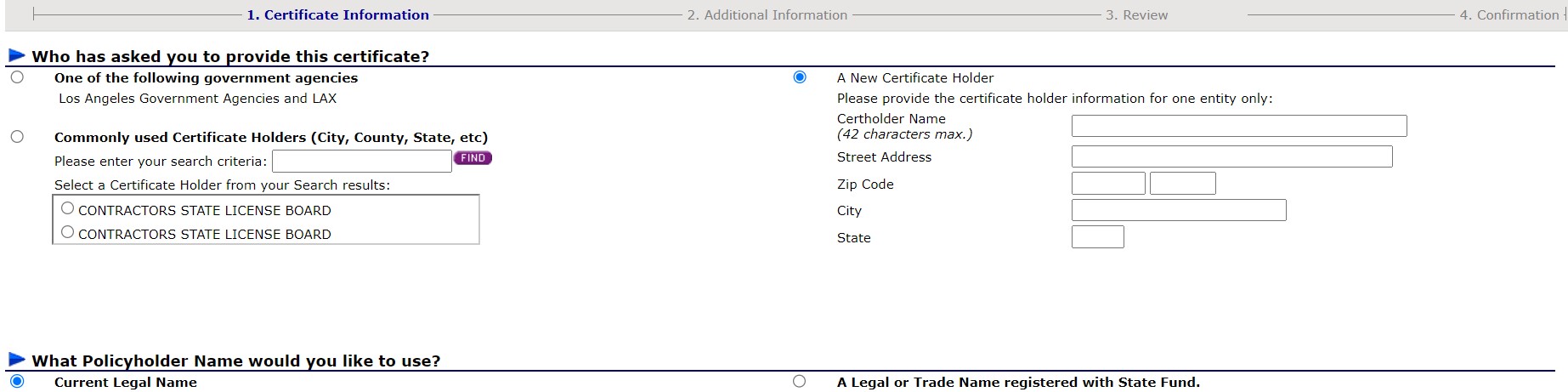 - Proporcione información básica sobre el certificado que necesita, incluyendo cualquier entidad gubernamental que pueda haber solicitado el certificado, el nombre y la dirección del titular del certificado, y si desea utilizar su nombre legal actual en el certificado o un nombre legal diferente o nombre comercial que haya sido registrado con nosotros. Luego haga clic en Siguiente.