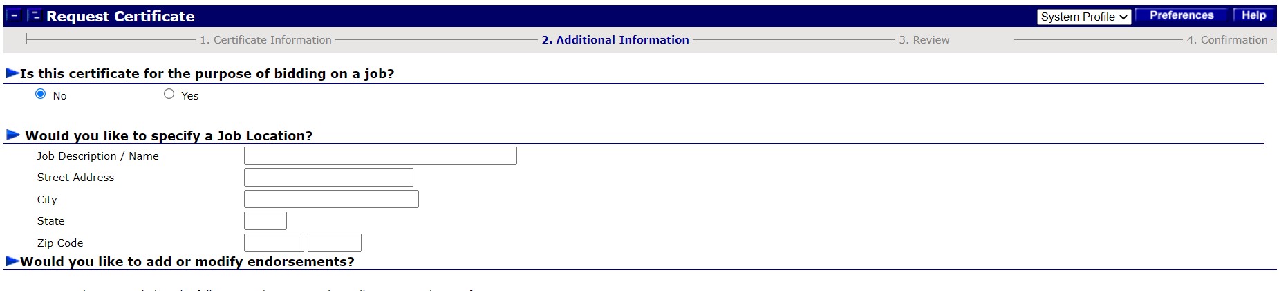 - A continuación, asegúrese de que sepamos si el certificado forma parte de un proceso de licitación de trabajo, si le gustaría especificar una ubicación laboral para el certificado y si necesita agregar o modificar algún endoso, como una renuncia a la subrogación. Una vez que se complete, verifique sus opciones y decida si desea que este certificado sea emitido nuevamente cuando se renueve su póliza. Después, haga clic en Enviar.