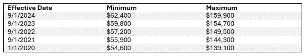Declare la nómina de cada funcionario o socio cubierto, sujeto a la “remuneración mínima y máxima” por año, que es el importe de nómina salarial más bajo y más alto utilizado para calcular la prima para la cobertura de los funcionarios. La Oficina de Clasificación de Seguros de Compensación de los Trabajadores de California (WCIRB, por sus siglas en inglés) establece importes anuales mínimos y máximos que las aseguradoras deben solicitar para los funcionarios con cobertura. Para las pólizas que se inicien o renueven a partir del 09/01/2024, el mínimo es de $62,400 y el máximo de $159,900. Esto significa que si un funcionario ganara $50,000 para el año de la póliza vigente a partir del 09/01/2024, la prima se basaría en $62,400. Del mismo modo, si un funcionario gana $170,000 para el año de póliza que entra en vigor el 09/01/2024, la prima para la cobertura de ese funcionario se basaría en $159.900. La prima se basa en el salario real para los ingresos comprendidos entre el mínimo y el máximo. Tenga en cuenta que el mínimo y el máximo se pueden ajustar anualmente y se pueden encontrar en la Parte 3, Sección V, Norma 1, Subreglas j-m y p del Plan Uniforme de Informes Estadísticos de Compensación de los Trabajadores de California-1995 . A continuación figura una lista de los mínimos y máximos recientes: