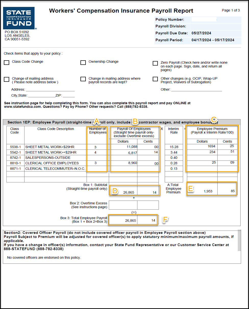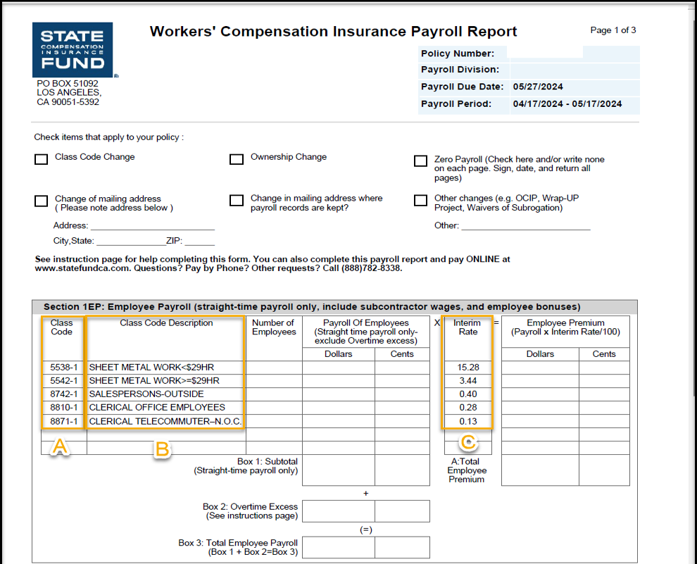 Si es un usuario registrado de State Fund en línea, puede seleccionar el enlace "Pagar nóminas y facturas pendientes" cuando haya iniciado sesión para enviar la declaración de nóminas. Si no está registrado en State Fund en línea, puede enviar su informe de nómina salarial en línea seleccionando «Pagar y presentar informe de nómina» en la página de inicio. Necesitará el número de póliza y el periodo de nómina salarial que figura en el informe de nómina. Obtenga más información sobre los beneficios de State Fund Online. También puede enviar una declaración de nóminas llamando al servicio de atención al cliente (888) 782-8338 de lunes a viernes, de 8.00 a.m. a 5.00 p.m., y hablar con un representante. Por último, puede enviar por correo postal su declaración de nóminas a: