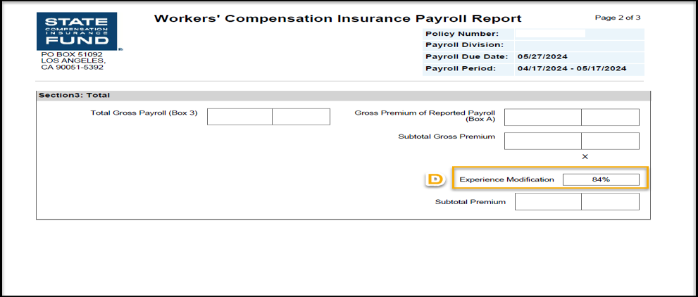 D) Una modificación de la experiencia (ex-mod) es un modificador de la prima calculado por la Oficina de Clasificación del Seguro de Compensación de los Trabajadores. La clasificación por experiencia permite que la prima de un empleador refleje su propia experiencia de pérdidas (frecuencia y gravedad de los reclamos de los trabajadores lesionados) en comparación con la experiencia de pérdidas promedio de otros empleadores de California en la misma industria. Hay una serie de variables que influyen en que una ex-mod sea superior o inferior al promedio (100%). Para obtener mayor información, sírvase visitar el sitio web WCIRB.