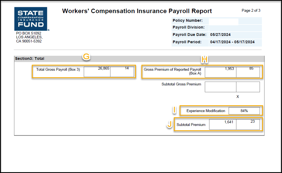 I) Multiplique la prima bruta de la nómina declarada [H] por su porcentaje de modificación de la experiencia [I] (si procede) para determinar la prima total adeudada.