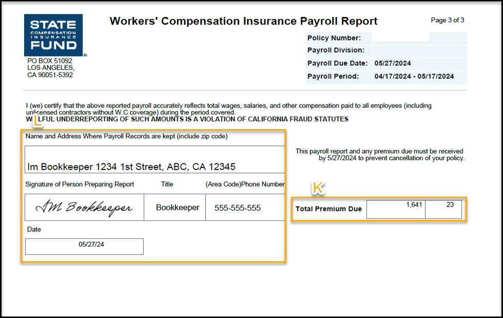 Si está realizando una declaración de nómina salarial mensual, el ejemplo siguiente es lo que verá normalmente cuando le enviemos una. Si está en facturación estipulada, tendrá que completar la declaración de la nómina salarial, pero no necesita calcular la prima de la nómina. El ejemplo siguiente es similar al que recibirá cuando le enviemos una declaración de la nómina salarial menos el cálculo de la prima de la nómina.