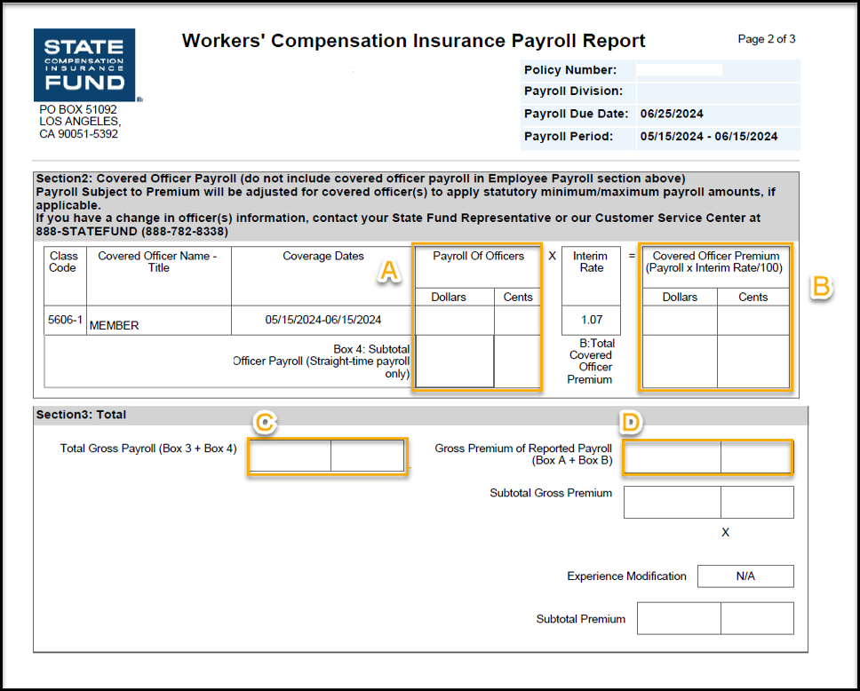 D) Sume la Prima Bruta de la Nómina Salarial Declarada de la Casilla A de la página anterior de la declaración de nómina a la Prima Total del Funcionario Cubierto [B], introduzca el total en Prima Bruta de la Nómina Salarial Declarada [D].