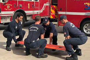 Firefighters using the proper squatting mechanics for lifting using hip hinge. Courtesy of the Phoenix Fire Department